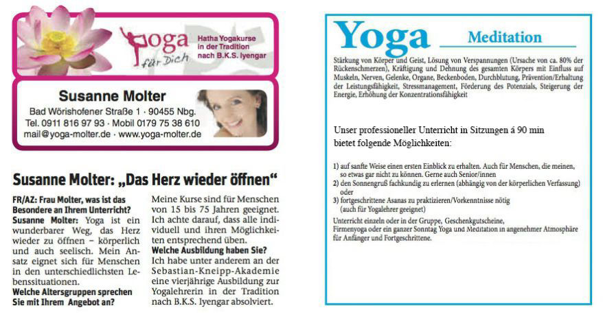 Schon nach meiner ersten Yogastunde 1999 wusste ich: Hier bin ich angekommen, denn ich habe schon lange nach einer Methode gesucht, körperliche Übungen, Fitness und Entspannung zu verbinden. Begeistert von der Yoga- Philosophie ließ ich mich zwischen 2001 und 2005 an der „Sebastian-Kneipp-Akademie“ zur Yogalehrerin SKA ausbilden. Es folgten u.a. Weiterbildungen bei Ursula Karven (auf Mallorca) und Anna Trökes (in Berlin). Sowohl dort als auch in meinen Kursen traf ich auf Menschen, die mit Yoga ihren Weg zu mehr Selbstvertrauen, Gelassenheit und innerer Stärke gefunden haben. Namasté
